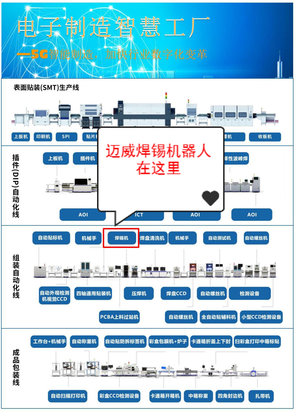 邁威是國(guó)內(nèi)領(lǐng)先的焊錫解決方案專(zhuān)業(yè)提供商,專(zhuān)注于焊錫自動(dòng)化領(lǐng)域,堅(jiān)持務(wù)實(shí)的經(jīng)營(yíng)理念,持續(xù)創(chuàng)新,為廣大電子產(chǎn)品制造商提供有競(jìng)爭(zhēng)力的焊錫設(shè)備。并致力于焊錫技術(shù)的研究與推廣,不斷提升客戶(hù)產(chǎn)品競(jìng)爭(zhēng)力。公司自推出首臺(tái)電腦版焊錫機(jī)以來(lái),不斷加大在焊錫領(lǐng)域的研發(fā)力度,陸續(xù)推出了多軸全自動(dòng)焊錫機(jī)、視覺(jué)焊錫機(jī)、伺服焊錫機(jī)、全自動(dòng)焊線(xiàn)機(jī)、智能激光焊錫機(jī)等產(chǎn)品。